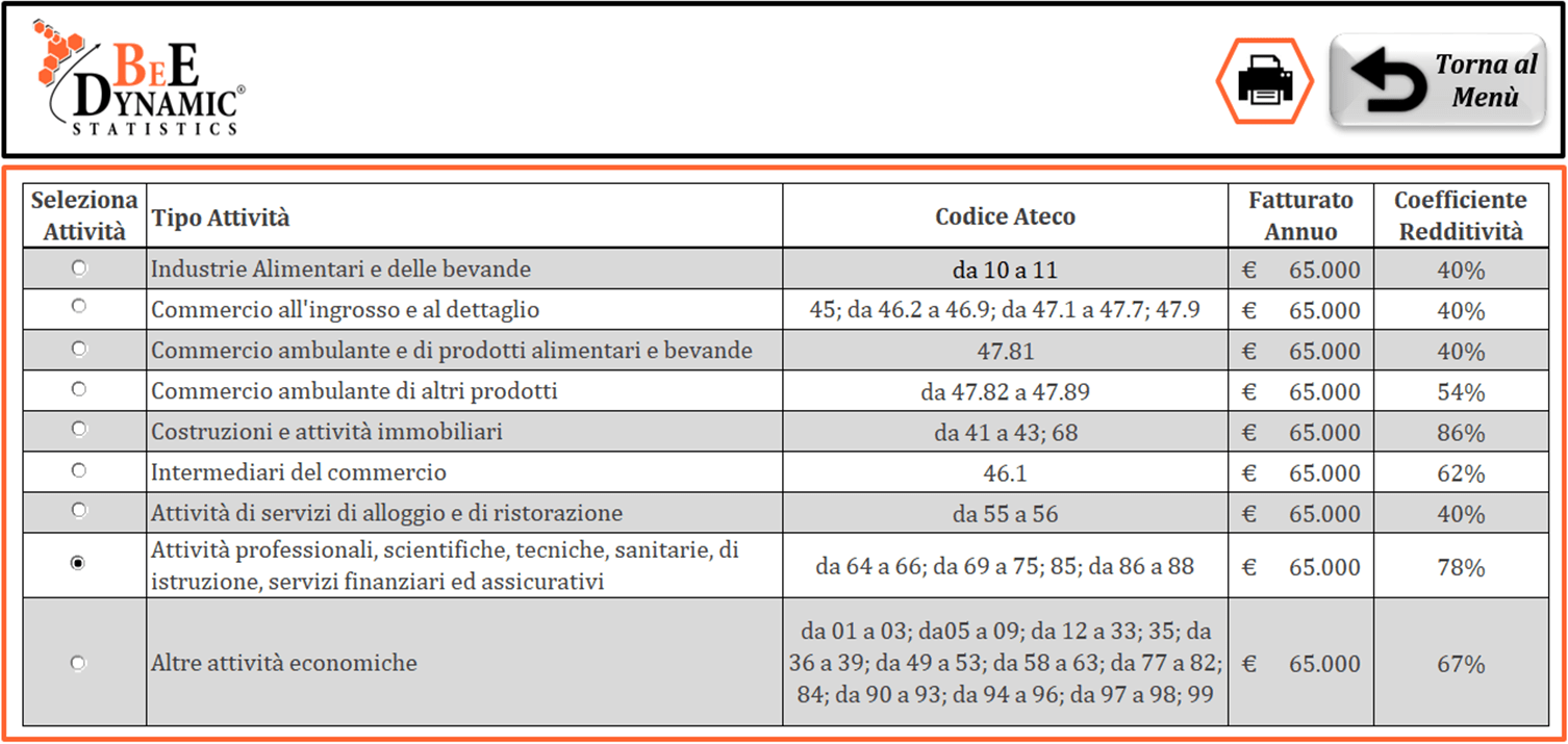BeE-InTime© è l’unico programma che permette tutto questo. E’ basato su tecnologia Microsoft (pacchetto Office – Excel), compatibile sia su Windows sia su Mac e gli algoritmi di calcolo sono automatizzati al 100%. Seleziona l’anno d’imposta e inserisci le fatture: preparati, organizzati, pianifica e avrai tutto sotto il pieno controllo.